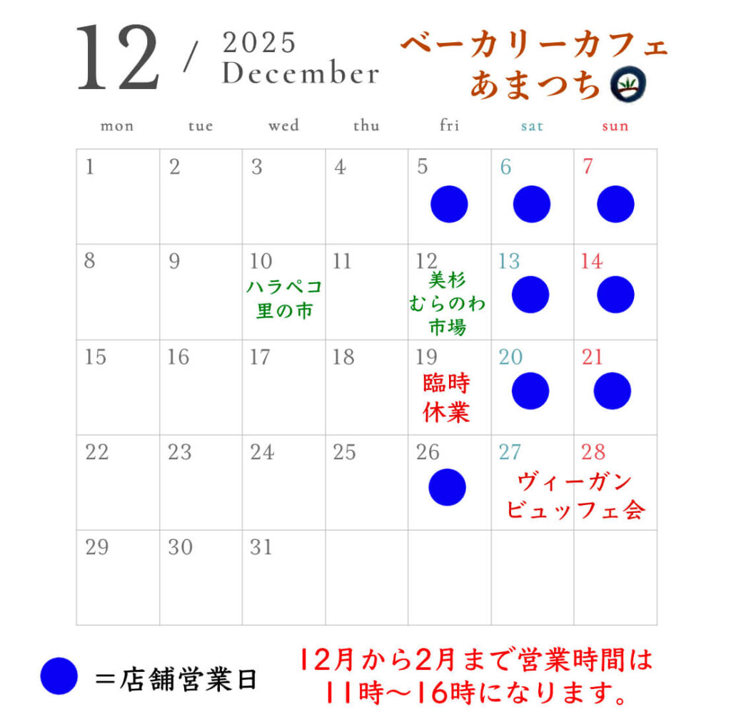 12月スケジュールのお知らせ🍞🥐今月から来年2月までは営業時間を11時から16時までとさせていただきますのでよろしくお願いいたします🙇また、12日(金)は美杉むらのわ市場に出店のため店舗は閉じます。19日(金)は臨時休業、27日(土)、28日(日)は予約制のヴィーガンビュッフェ会でパン販売は行いませんので、通常の最終営業日は26日(金)です。年始は1月4日(日)まで休業し、9日(金)から営業再開致します🌅ヴィーガンビュッフェ会は各日ともまだ3名程空きがございます。ご希望の方はDMでご予約をお願いします✉️・12月10日(水)11:00-14:00ハラペコ里の市@peko_satonoichi場所 : ハラペコあおむし 三重県名張市上小波田1810−6・12日(金)10:00-14:00美杉むらのわ市場@muranowainst 場所:美杉村竹原小学校グラウンド三重県津市美杉町竹原2777▼美杉町竹原特産物直売所 ちどりの里への出品日:12月6日・13日・20日・27日(土) 名松線伊勢竹原駅近くの踏切前のバスロータリー広場 開催時間 7:00-11:30以上です。変則的ですが、今月もよろしくお願いいたします🙏スイーツ主任が新しく始めた「まること鍼灸院」もカフェ隣に併設しております。完全予約制ですが、お身体のお悩みのある方はお気軽にご相談ください🍀鍼灸アカウントはこちら→@marukoto.acupunctureベーカリーカフェ あまつち三重県津市白山町三ケ野3393-1