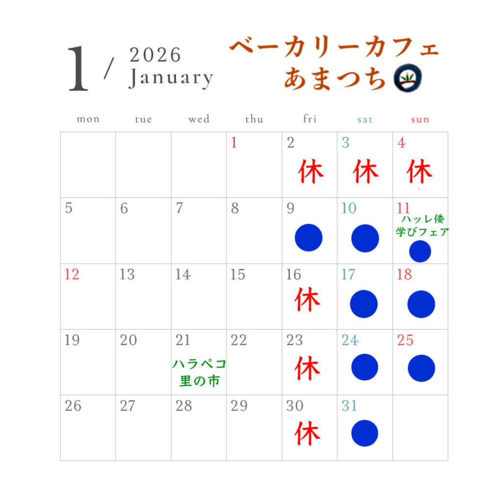 今年も残り僅かとなりましたので、来月のスケジュールのお知らせと共に年の瀬のご挨拶を致します。今年はカフェとして移転オープンし、スイーツ主任はその隣に鍼灸院(まること鍼灸院)を開設する運びとなり、新たな始まりの年となりました🌱パン・スイーツ以外のヴィーガン料理も楽しんでいただきたいという思いから、年末は感謝祭としてビュッフェ会を開くこともしました🍽️あまつちとしては「食」を、まること鍼灸院としては「医療」を提供してきましたが、来年もまた新たな試みを考えております🍀カフェメニューも充実させていく所存ですので楽しみにしていただけたらと存じます🌾今年一年も大変お世話になりました!!来年もどうぞよろしくお願いいたします🐎良いお年をお迎えください🎍——————————————–【2026年1月スケジュール】新年の営業は1月9日(金)から始まります。その翌週以降は金曜日はしばらく休業とし、土日営業のみとさせていただきますので、よろしくお願いいたします🙇▼マルシェ出店・1月11日(日) 10:00-15:30ハッレ倭 出会いと学びのわかちあいフェア@yamato.fair場所:ハッレ倭三重県津市白山町中ノ村138-4※この日は店舗営業もします。・21日(水)11:00-14:00ハラペコ里の市@peko_satonoichi場所 : ハラペコあおむし三重県名張市上小波田1810−6▼ 美杉町竹原特産物直売所 ちどりの里への出品日:1月10日・17日・24日・31日(土)名松線伊勢竹原駅 すぐ近くの広場開催時間 7:00-11:30——————————————–