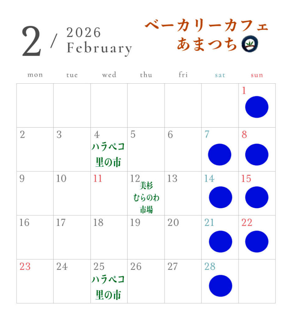 【マルシェ出店】 ・2月4日・25日(水)11:00-14:00 ハラペコ里の市 @peko_satonoichi 場所 : ハラペコあおむし 三重県名張市上小波田1810−6 ・12日(木)10:00-14:00 美杉むらのわ市場 @muranowainst 場所:美杉村竹原小学校グラウンド 三重県津市美杉町竹原2777 【美杉町竹原特産物直売所 ちどりの里】 出品日:2月7日・14日・21日・28日(土) 名松線伊勢竹原駅近くの踏切前のバスロータリー広場 開催時間 7:00-11:30 以上です。 スイーツ主任が運営している「まること鍼灸院」もカフェ隣に併設しております。 完全予約制ですが、お身体のお悩みのある方はお気軽にご相談ください。 鍼灸アカウントはこちら→@marukoto.acupuncture ベーカリーカフェ あまつち 三重県津市白山町三ケ野3393-1